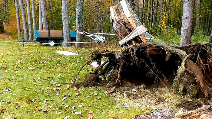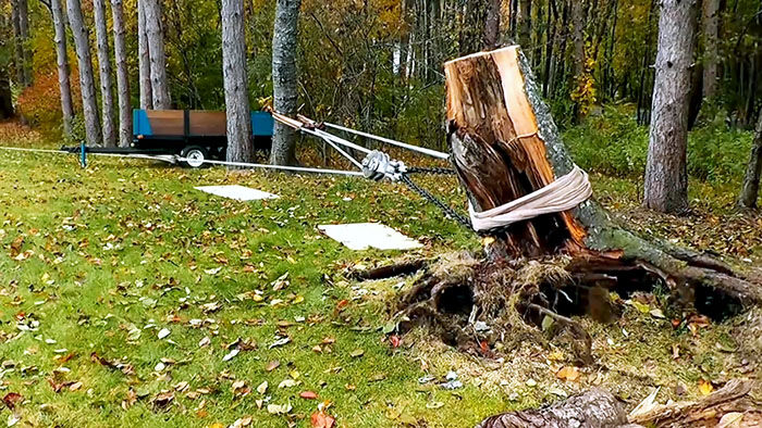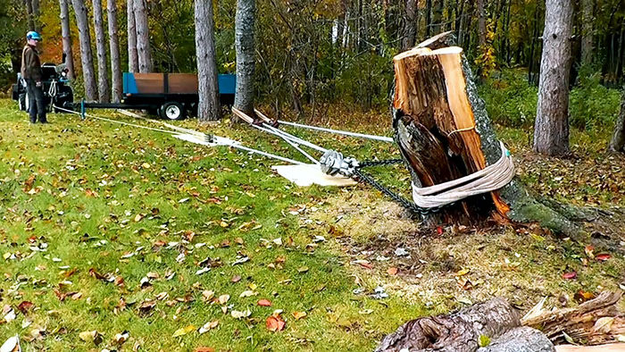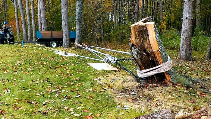 Система занимает свое место с учетом высоты расположения блоков, трос натягивается. Если конечного усилия достаточно, то пенек начнет вырываться с земли.