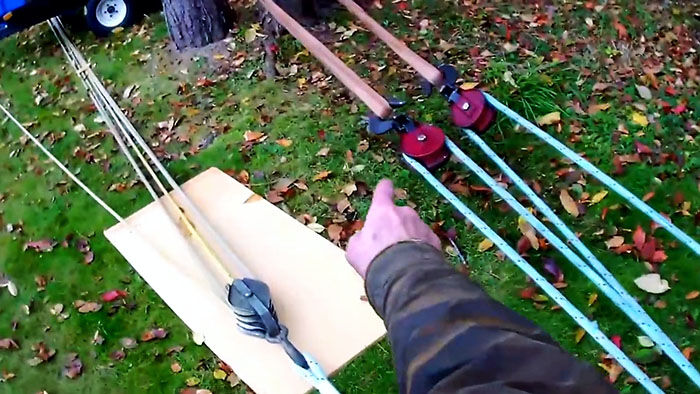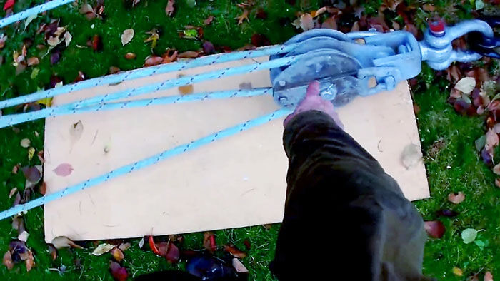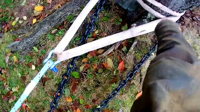 Блоки привязывайте к рядом стоящим деревьям, пользуйтесь канатами или тросами. Главное условие — они должны быть прочными и выдержать нагрузку. В нашем случае полиспаст состоит из семи роликов. Все элементы надо располагать примерно в оной плоскости. Последний блок следует привязывать с учетом направления движения трактора.