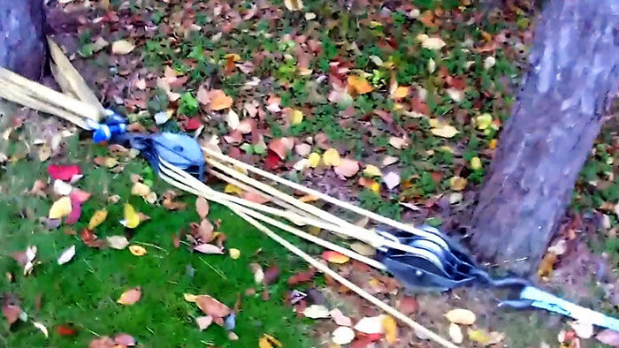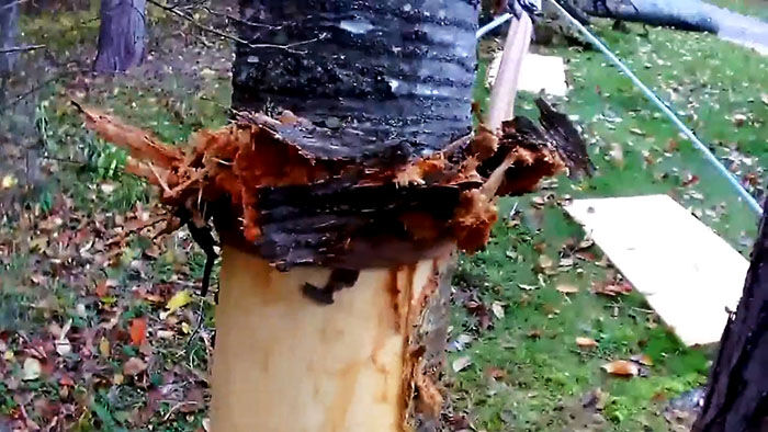 Слишком низко установленные блоки поднимаются и сильно повреждают кору деревьев, к которым они привязаны. Можно между деревом и тросом подставить обрезки досок, они предохранят его от сильных повреждений.