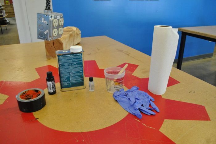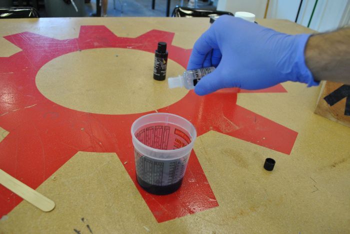 2. Подготавливаем рабочий состав, добавляя в смолу дозированное количество катализатора, интенсивно перемешивая ингредиенты 1-2 минуты. Смоле можно придать цвет восстанавливаемого материала, добавлением в нее соответствующего пигмента.