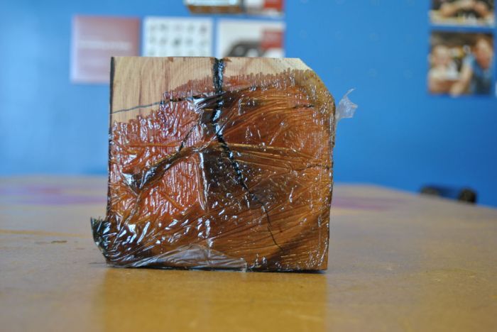 1. Заклеиваем скотчем трещины на торцах деревянной детали и снизу, чтобы связующий состав не вытекал через них наружу. Если площадь торца большая, можно надеть на него пластиковый пакет и закрепить скотчем.