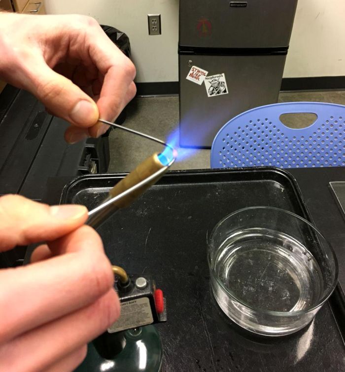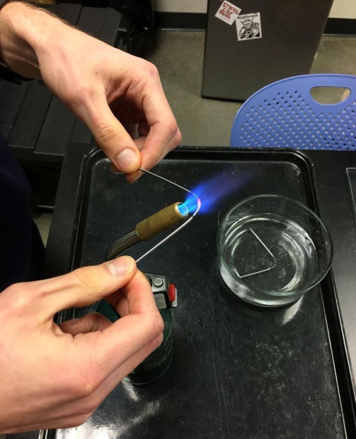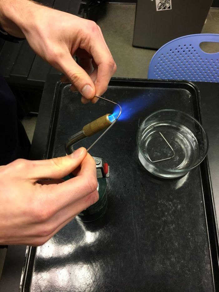 Помещаем изогнутую часть стержня «U» в самую горячую часть пламени, удерживая за два конца стального стержня.