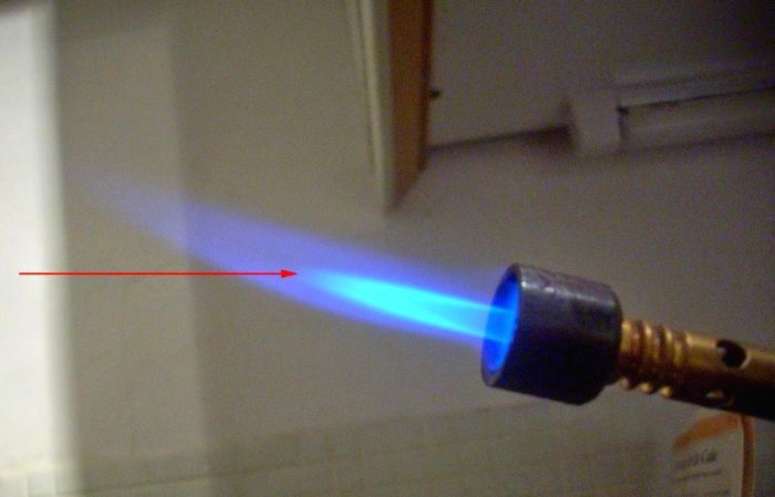 Самая горячая часть пламени - маленький конус примерно на половине длины факела. Убедитесь, что вы вращаете стержень, пока он нагревается пламенем, так обеспечивается равномерность разогрева. В точке наибольшего нагрева начинается перестройка атомов железа, углерода и легирующих компонентов.