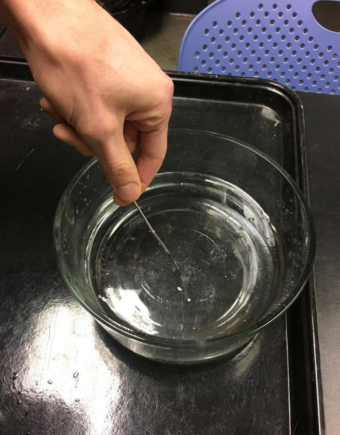 Когда стержень, в месте нагрева станет ярко-оранжевого цвета, выньте стержень из пламени и быстро окуните его в воду внутри емкости, как показано на фотографии (называется «гашение»). Гашение уменьшает движение атомов, и может быть проиллюстрировано как «замораживание» атомов стали на новом месте. В этот момент атомы находятся в неустойчивом положении.