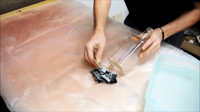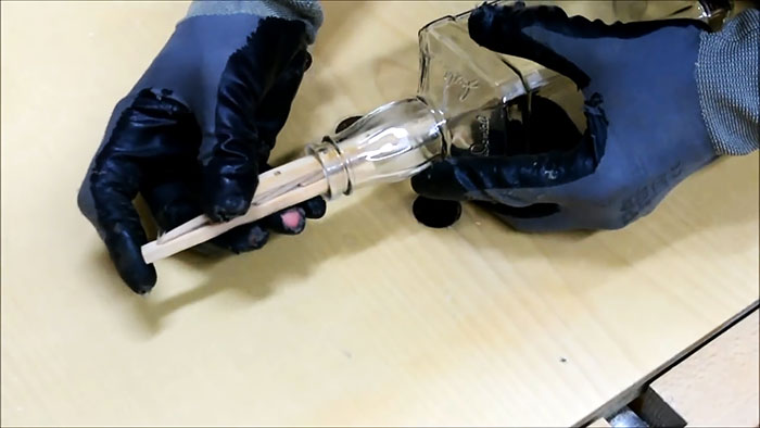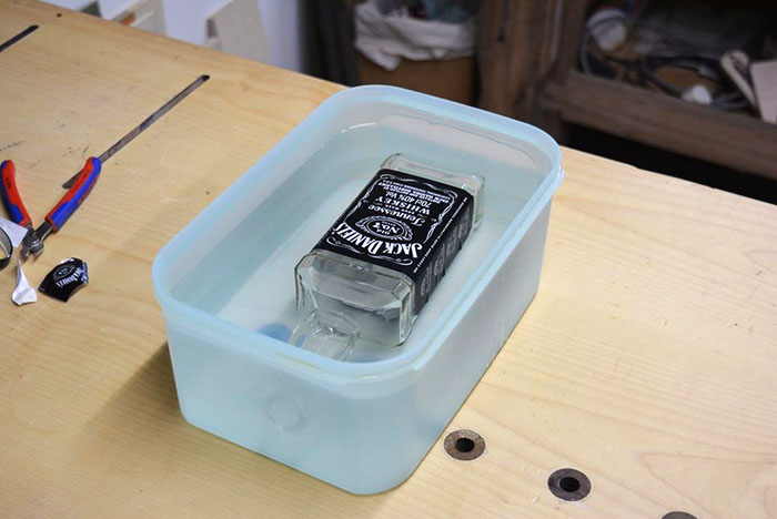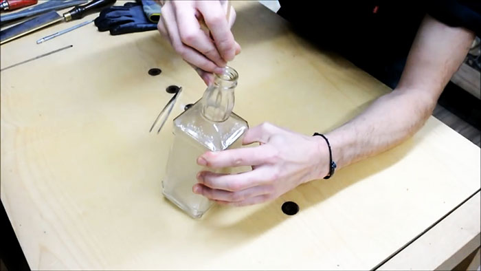 На первом этапе нужно подготовить бутылку. Открутите крышку, снимите остатки наклеек акцизной марки.