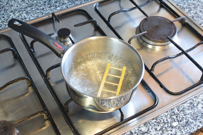 Закипятите в любой посудине подходящих размеров воду, опустите в нее собранную лестницу. Оставьте примерно на десять минут.