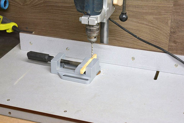Зажмите две заготовки в тисках и просверлите сквозные отверстия сразу в двух стойках. Диаметр должен соответствовать диаметру круглых палочек для ступенек, детали собираются с небольшим натяжением.