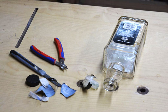 Из инструментов понадобится стусло, ножовка по дереву с мелкими зубьями, шлифовальная шкурка, сверлильный станочек, тиски и измерительные инструменты. Бутылка замачивается в емкости подходящего размера, для снятия наклеек используются старые пластиковые карты.