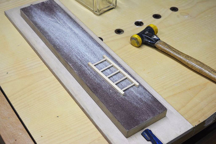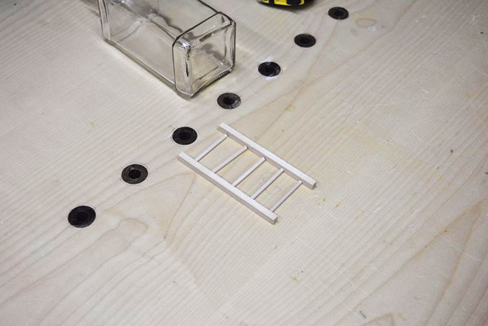 Для вертикальных опор приставной лестницы требуется подготовить квадратные рейки 5×5 мм, перекладины изготавливаются из круглых палочек диаметра 2–3 мм. Важное условие – для перекладин надо брать заготовки из ивы или березы, иные породы деревьев плохо сгибаются. Нужна и бутылка, желательно квадратной формы, в ней поделка смотрится внушительнее.