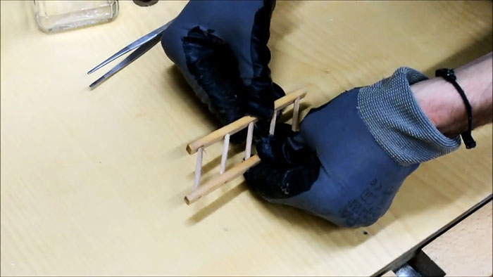 Пинцетом достаньте из кипятка изделие и в горячем виде согните его по длине. Если ступеньки гнутся тяжело, то повторно прокипятите лестницу. Работайте в рукавицах, дерево горячее. Все делайте быстро, если лестница остынет в согнутом положении, то она потом не выпрямится до начального состояния.