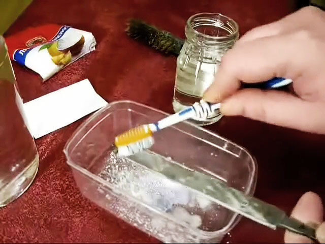 Также до травления напильник обезжириваем. Для этого помещаем его над удлиненной кюветой, посыпаем щелочным чистящим средством, например, стиральным порошком, и смоченной в воде, зубной щеткой удаляем остатки грязи, жира и масел.