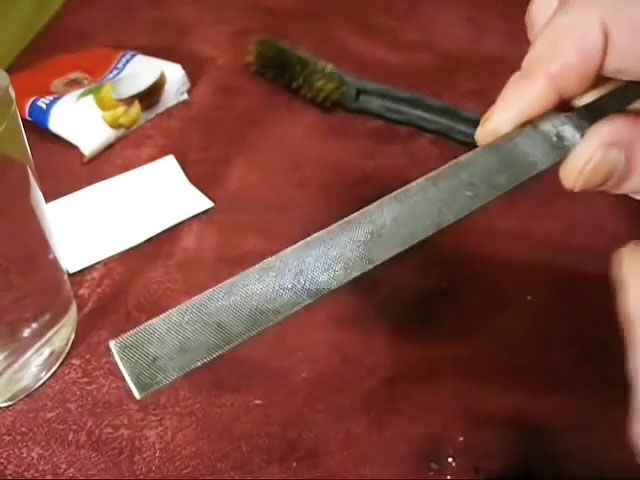 Метод восстановления напильника травлением основан на том, что площадь зубьев насечки намного меньше общей рабочей площади. Поэтому съем металла с зубьев идет быстрее, чем в других местах. Кстати, лимонную кислоту или уксус, можно заменить на хлорное железо в небольших дозах.