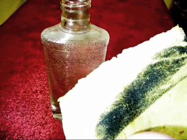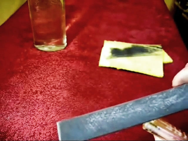После 12 часов выдержки вытаскиваем напильник из раствора и проверяем качество заточки. Для этого обтираем его о губку и видим на ней черный налет. Это не что иное, как протравленный металл преимущественно с зубьев насечки.