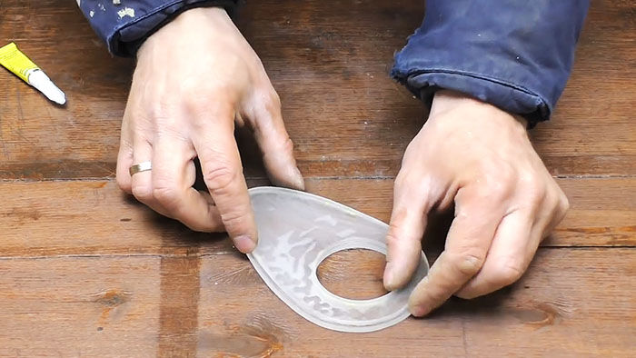 Другая сторона овала должна сужаться, в результате чего вся конструкция будет напоминать указатель или стрелку. Вырезаем сначала при помощи фрезы отверстие, а затем лобзиком всю деталь. Таких заготовок потребуется сделать две штуки.