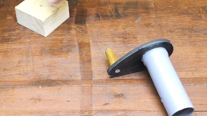 Далее в узкой части детали сверлим отверстие с углублением для плоской шляпки, вставляем его со стороны трубы, закручиваем гайку, фиксируя штырь на пластине, и надеваем полую трубку.