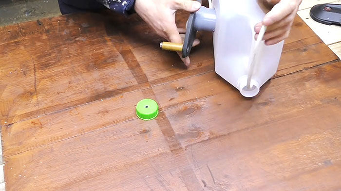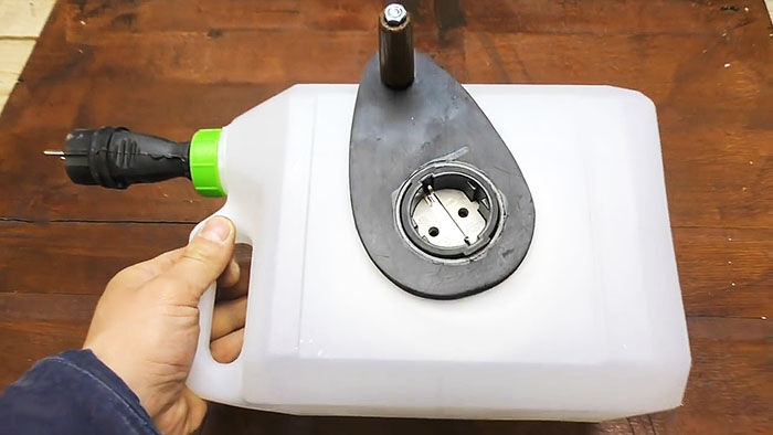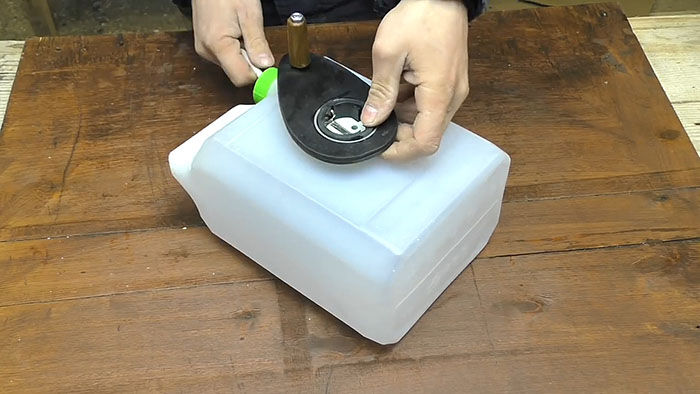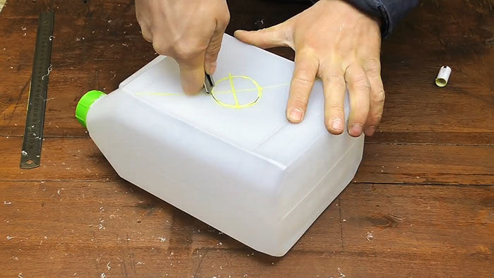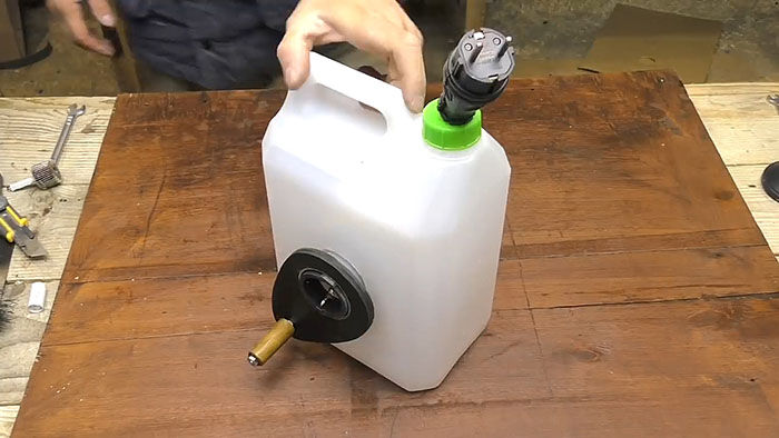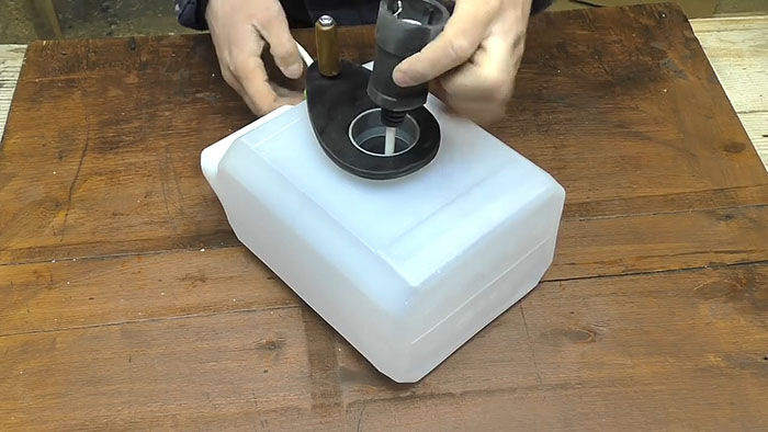 Первым делом необходимо высверлить отверстие в крышке канистры. Диаметр подбираем таким образом, чтобы он соответствовал толщине провода (в нашем случае это 8 мм).