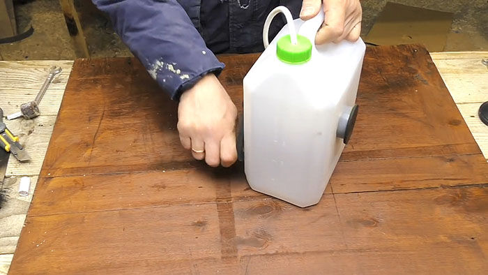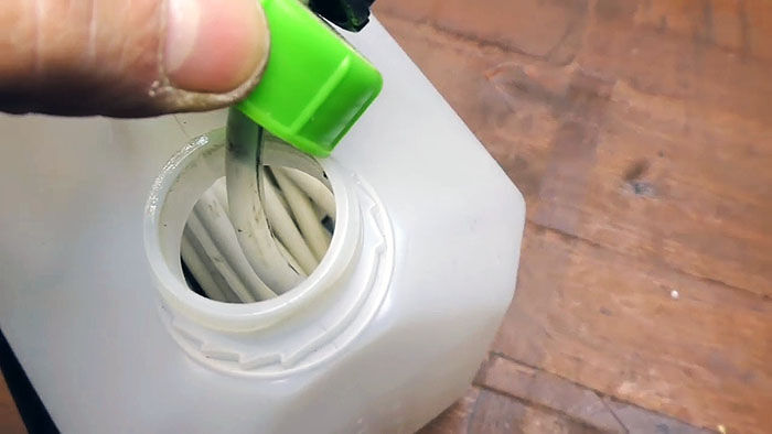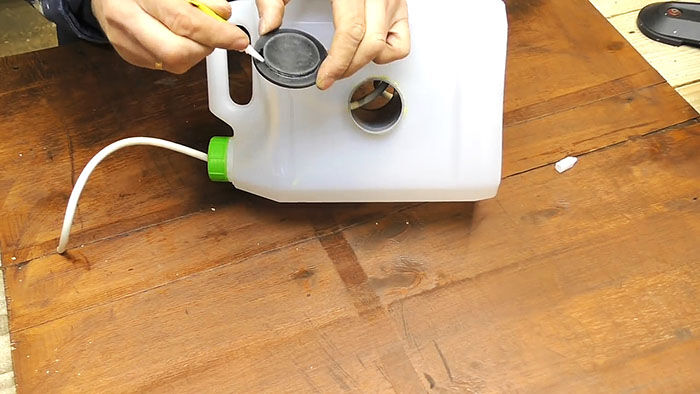 Далее заводим его в канистру через проем под большой край трубы и выводим через крышку.