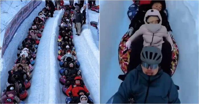 В Китае появилось новое, захватывающее зимнее развлечение, которое уже успело покорить сердца любителей острых ощущений и эффектных зрелищ. Речь идет о так называемом "снежном высокоскоростном поезде", который на самом деле представляет собой целую вереницу смельчаков, спускающихся с заснеженных склонов на надувных санках-ватрушках.