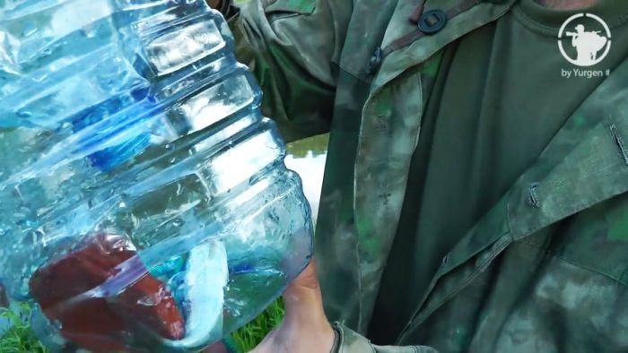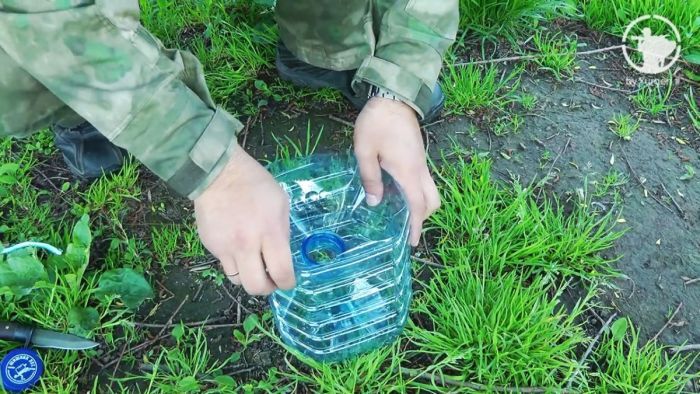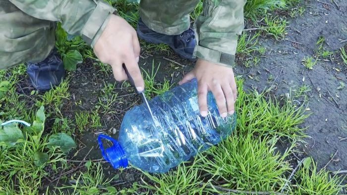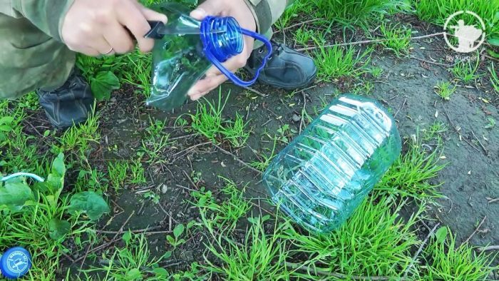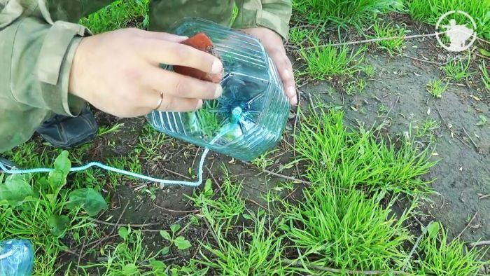 Открутите крышку и снимите пластиковую ручку. Она фиксируется по периметру горлышка, острием ножа разрежьте его и удалите. Это надо делать обязательно – ручка двигается и отпугивает рыбу.