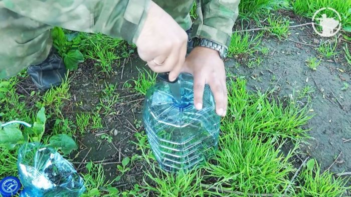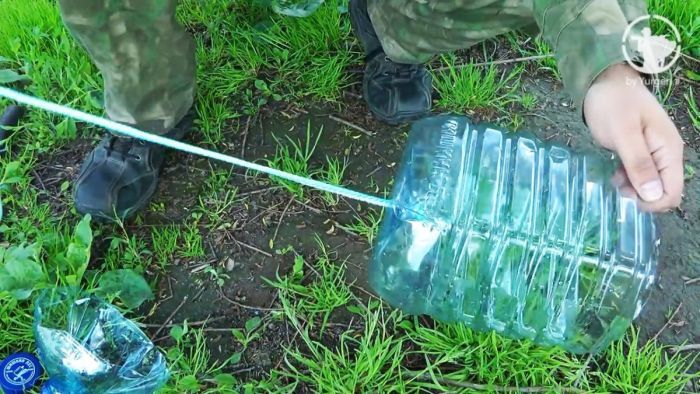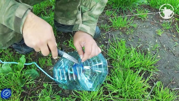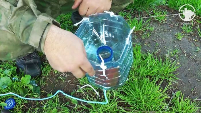 Приспособление изготавливается из пятилитровой пластиковой бутыли и веревки длиной 4–5 метров. Емкость разрезается обыкновенным ножом.