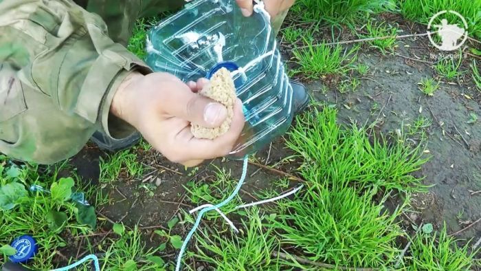 Самодельный пластиковый ятерь готов. В качестве приманки опустите на дно мякиш хлеба, желательно его предварительно немного смочить в воде и сделать плотные шарики. Нет хлеба – накопайте червей, но даже на пустую бутылку есть шанс поймать рыбу.