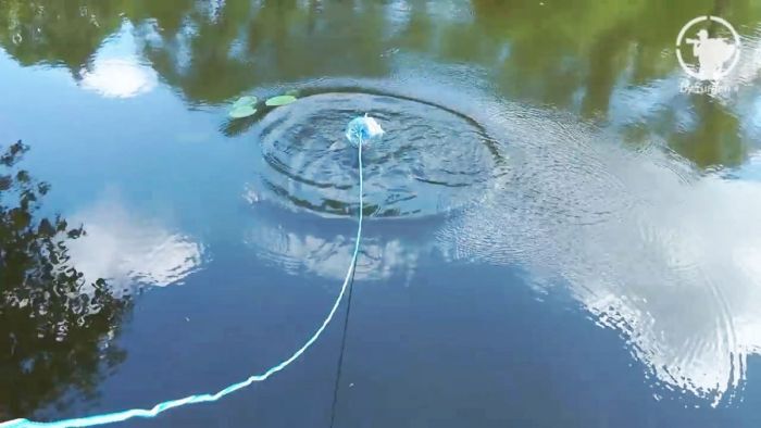 Теперь осталось ее закинуть как можно дальше от берега, опытные рыбаки знают рыбные места. Ловушка постепенно заполнится водой и опустится на дно.