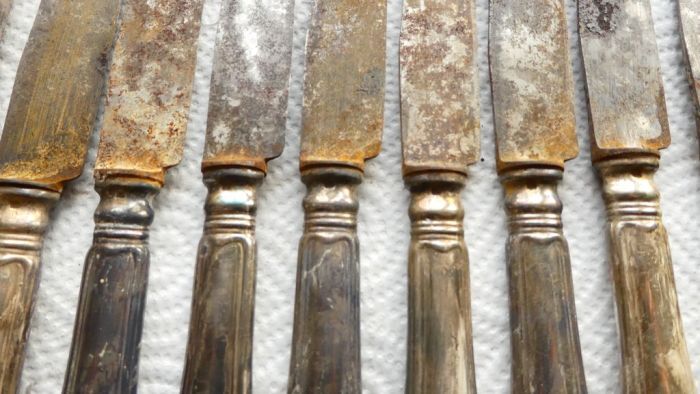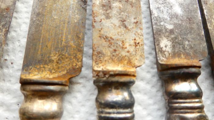 Как видно, на ложках ни следа потемнения. Ножи тоже стали выглядеть лучше, однако, к сожалению, часть серебряного слоя исчезла с их поверхности, всё-таки время берёт своё. Придётся отнести их специалисту для повторного посеребрения.
