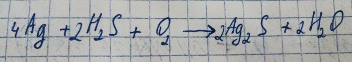 Однако, серебро реагирует с сероводородом в присутствии кислорода. Уравнение данной реакции выглядит следующим образом: