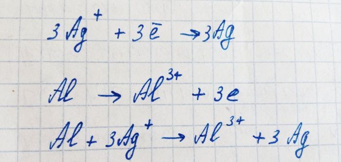 Алюминий имеет более низкую энергию ионизации, чем серебро. Он окисляется до иона, сообщая серебру свои электроны. Этот процесс можно записать так: