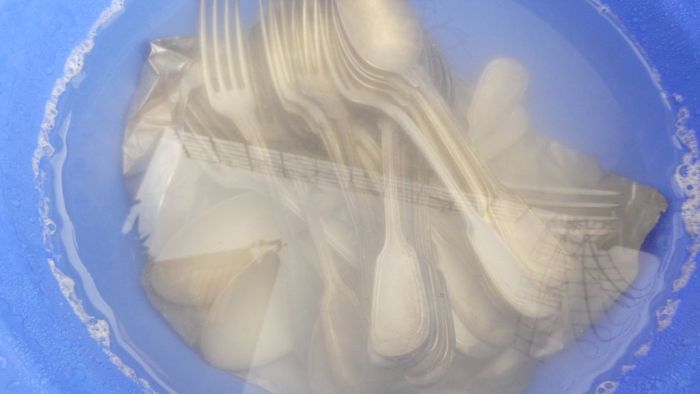 Данный процесс может занять до получаса времени. По окончании необходимо промыть столовые приборы водой и вытереть насухо полотенцем.