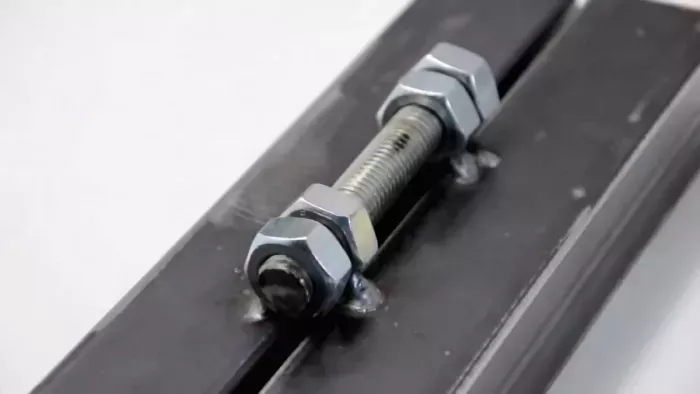 Выставляем железную конструкцию (для удобства работ ей лучше придать горизонтальное положение). Накладываем самодельную петлю таким образом, чтобы ее ось находилась между краями труб будущей двери и ее рамы и была им параллельна. Сварочные работы выполняем следующим образом: с рамой соединяем нижние гайки на обоих концах шарнира, с подвижной дверью – верхние. Это обеспечит максимальную надежность и устойчивость к нагрузкам.