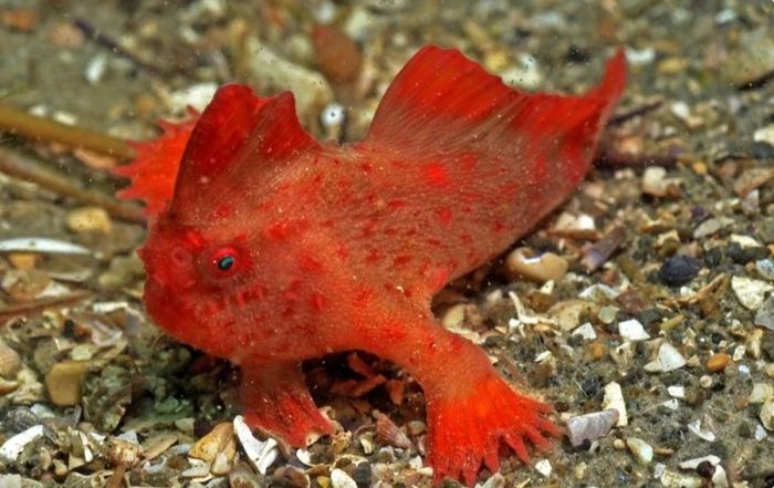 Одной такой необычной рыбой является красный нетопырь, или как ее кличут ихтиологи Thymichthys politus, принадлежит к семейству брахионихтиевых, название семейство получило от латинского brachium, переводится как «рука от локтя до кисти», и древне-греческого «рыба».