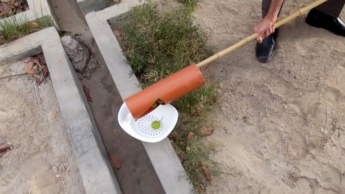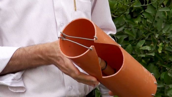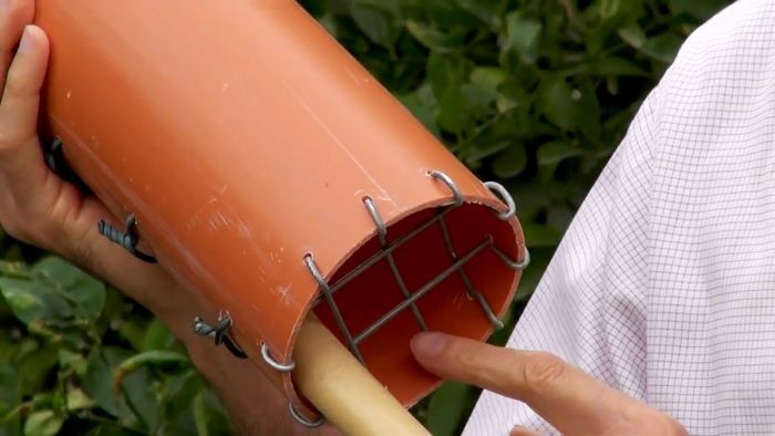 Устройство делается из куска пластиковой трубы диаметром 100-150 мм, длина примерно 40 см. Для вырезания отверстия можно пользоваться болгаркой или ножовкой. В торцах трубы надо фиксировать поволоку, требуется примерно 1 м диаметром 1–2 мм, для загиба и откусывания необходимо иметь плоскогубцы. Отверстия под проволоку высверливаются дрелью или проделываются горячим гвоздем соответствующего диаметра. Второй вариант предпочтительнее, сверлить гладкую круглую пластиковую трубу сложно. Приспособление прикреплено к длинной палке.