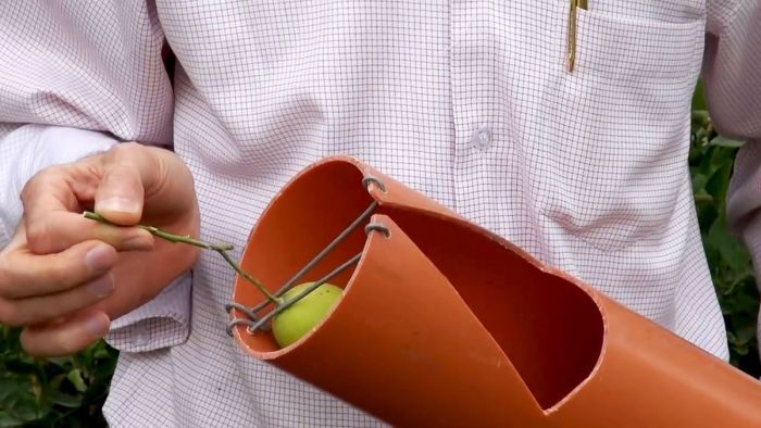Плоды следует захватывать через отверстие в трубе, плодоножка автоматически оказывается в верхней части и попадает между двух проволок. Далее надо потянуть приспособление вниз и оторвать плодоножку от ветки. Собранный урожай аккуратно высыпается в подготовленную тару.