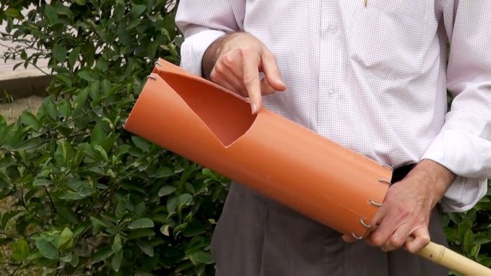 С одного торца трубы вырежьте отверстие в виде равностороннего треугольника. Высота примерно 15 см, длина основания 10 см. У вершины сделайте прорезь: отверстием захватываются плоды, а плодоножка входит в прорезь. Желательно острые кромки сточить под фаску - минимизируется вероятность повреждения урожая.