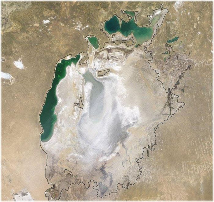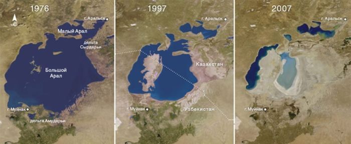 Также стоит отметить, что море разделилось на две части, западную и восточную. Западная практически полностью пересохла, восточная на данный момент существует.