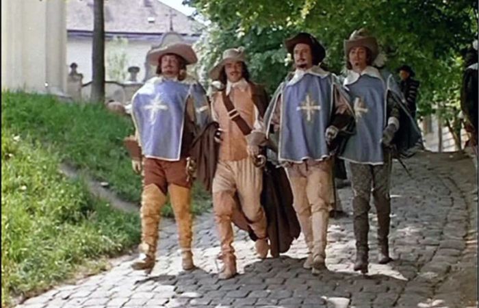Вольность в изображении шпаг — лишь одна из многих стилизаций, которые создатели фильма позволили себе ради зрелищности и яркости характеров. Картина Юнгвальд-Хилькевича с самого начала задумывалась не как историческая хроника, а как музыкальная приключенческая комедия, где на первом месте стоит авантюрная атмосфера. Яркий тому пример – костюмы. Художники по костюмам даже не пытались воссоздать моду Франции XVII века. Вместо этого они разработали условно-исторический театральный гардероб, где каждый цвет и фактура работали на раскрытие образа. Бордовый бархат Атоса, ярко-голубой камзол д'Артаньяна, пурпур Портоса — это сценические костюмы, при помощи которых зрителю показывали характер персонажа. Реальная одежда той эпохи, даже аристократическая, часто была более практичной, тёмной и менее броской, что было вполне логично в условиях парижской грязи.