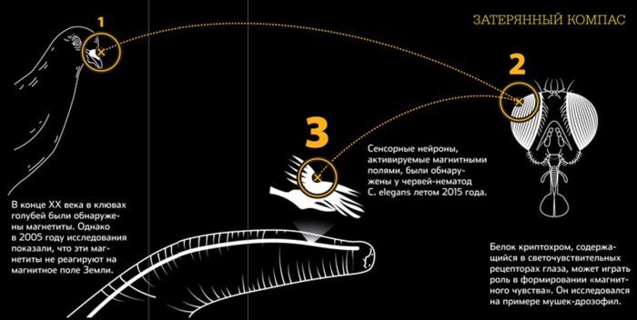 Над учеными, которые хотели исследовать способность чувствовать магнитные поля — магниторецепцию, как ее еще называют, — поначалу только смеялись. Причем насмехались даже над исследованиями с участием животных, например, почтовых голубей, хотя сейчас считается очевидным тот факт, что голуби находят дорогу домой, ориентируясь на магнитное поле Земли. Современные ученые обнаружили, что практически каждое мигрирующее животное, будь то птица или рыба, имеет встроенный компас. Магниторецепцией, на удивление многих, обладают такие животные, как лобстеры, черви, лягушки и улитки.