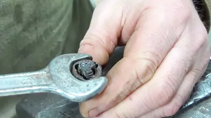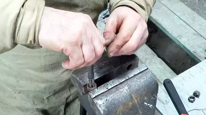 Накручивая изготовленный нами инструмент на деталь с испорченной резьбой, прорезаем повреждённые нитки.