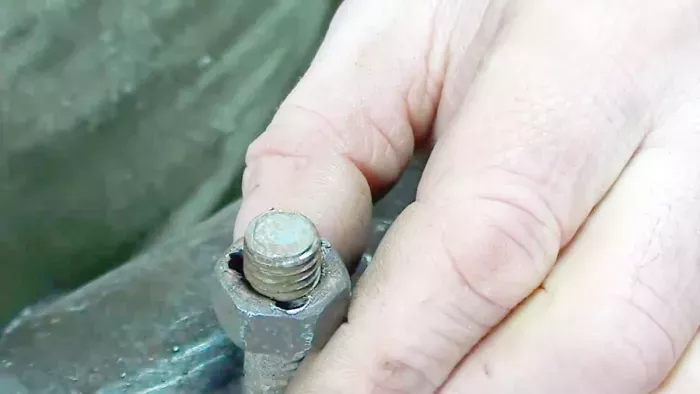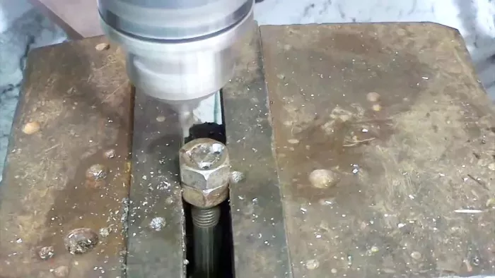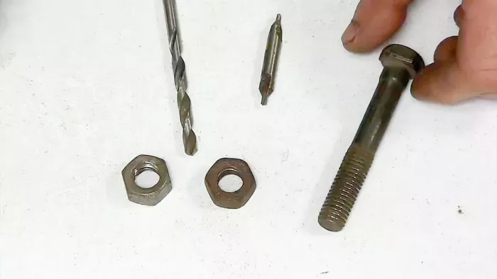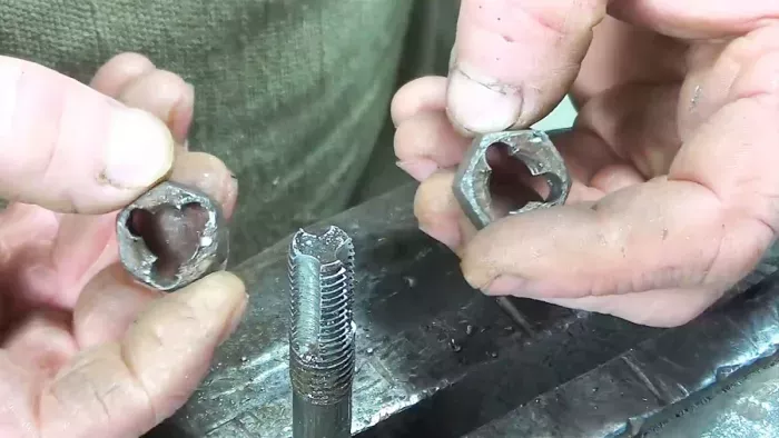 В результате из болта получилось подобие метчика, но без конуса, гайки стали похожими на плашки для нарезания резьбы. Благодаря образовавшимся при высверливании острым режущим кромкам на резьбовых нитках болта и гаек, теперь они могут использоваться для восстановления внутренней и наружной резьбы.