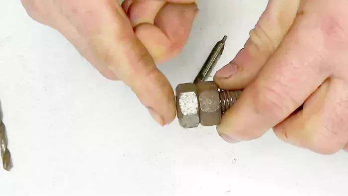 Накручиваем обе гайки на болт. Вторая накрученная гайка должна располагаться на конце болтовой резьбы, заподлицо с торцом болта. Гайка, накрученная на болт первой, играет роль контргайки, обеспечивая надёжную фиксацию. Это исключит смещение гаек по резьбе при последующей обработке.