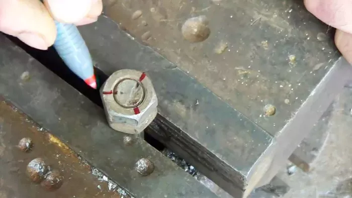 По окружности болтового торца, на линии его соединения с гайкой отмечаем маркером три точки, равномерно расположенные по окружности.