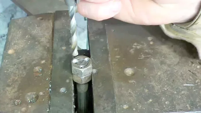 Зажав нашу конструкцию соответствующим образом, высверливаем три отверстия в размеченных точках. Глубина отверстий равна толщине гаек, то есть, просверливаем обе гайки насквозь. Толщина сверла в моём случае примерно в два раза меньше диаметра болта. Можно выбрать сверло тоньше, более толстое может сильно ослабить гайку. В общем, найдите золотую середину. Для удобства я вначале высверлил небольшие углубления сверлом маленького диаметра.