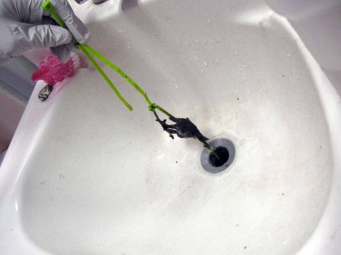 Периодически стяжки нужно вытягивать и очищать. С каждым разом их следует погружать все глубже, чтобы захватить как можно больше волос из засора. После вылова всех клочков следует проверить насколько улучшилась скорость слива воды. Сам инструмент можно выкинуть в мусор, поскольку при необходимости повторной чистки раковины легко сделать другие крючки. Обычно стяжки продаются упаковкой по 100 штук и стоят копейки, поэтому прочищать засоры без повторных затрат получится годами. Если не хочется вручную снимать клочки из шипов, можно уделить больше времени сделав несколько приспособлений и после засорения одного использовать новое.
