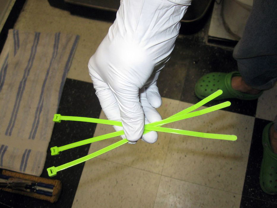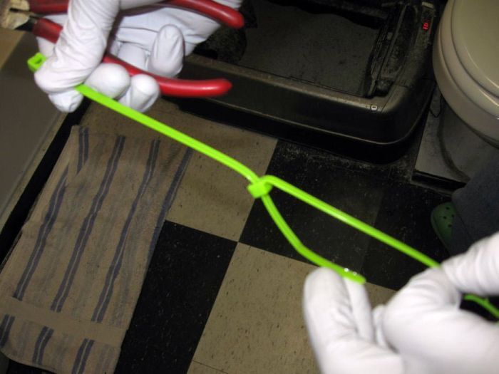 Первым делом нужно соединить 3 стяжки, чтобы получить достаточно длинное приспособление для доступа в труднодоступные места слива. Для этого конец одного хомута заводится в замок другого.