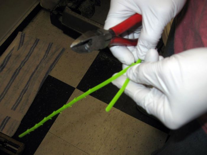 Полученные насечки нужно согнуть в бок, чтобы получить выступающие колючки. При этом правые шипы выгибаются в одну сторону, а левые в противоположную.