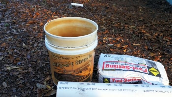 Старое пластиковое ведро из-под строительных материалов емкостью примерно 20 литров, любую смесь на цементной основе и кусок пластиковой трубы 10 см, длина должна быть больше суммы диаметра и высоты емкости. Для заливки раствора надо пользоваться кельней и гладилкой, труба режется дисковой поворотной отрезной пилой. Пластиковое ведро разрезается ножовкой по металлу.