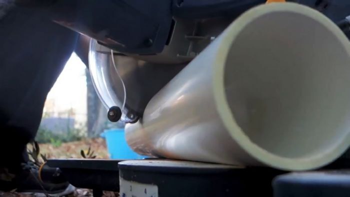 Установите на распилочном станке трубу и под прямым углом отрежьте один ее конец, а второй под углом 45 градусов. Таких заготовок требуется две штуки. Длина одной должна на 8—10 см превышать радиус емкости, а второй на столько же больше высоты ведра.