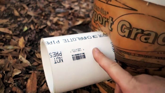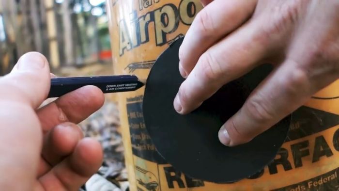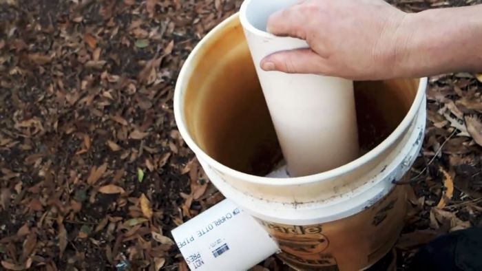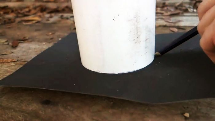 Поставьте трубу вертикально и на плотной бумаге обведите по окружности, таким способом изготавливается шаблон для рисования отверстия в ведре. Монтажным ножом вырежьте круг.