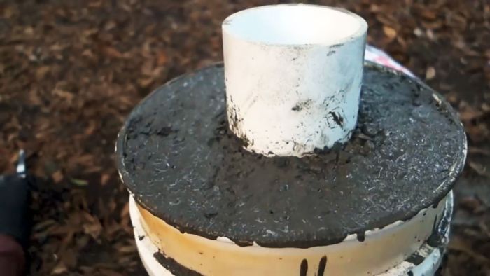 Затем ставьте вертикальную трубу, точно совместите отрезанные торцы. Слоями толщиной примерно 10 см насыпайте смесь и смачивайте водой. По наполнению емкости верхнюю поверхность выровняйте гладилкой.